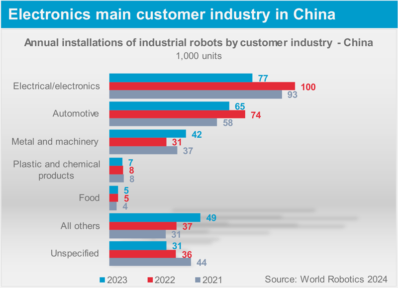 国際ロボット連盟(International Federation of Robotics)が2024年9月に発表した『World Robotics2024』より、中国における電子機器の主要な顧客産業は「電気/電子機器」、「自動車」、「金属機械」が上位導入業種となっています。