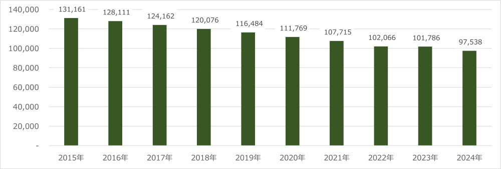外務省が公表する「海外在留邦人数調査統計」によると、直近10年において中国に滞在する日本人の数は減少傾向にあります。2014年の13万3,902人をピークに減少を続け、2024年には10万人を下回る9万7,538人となりました。(図1)