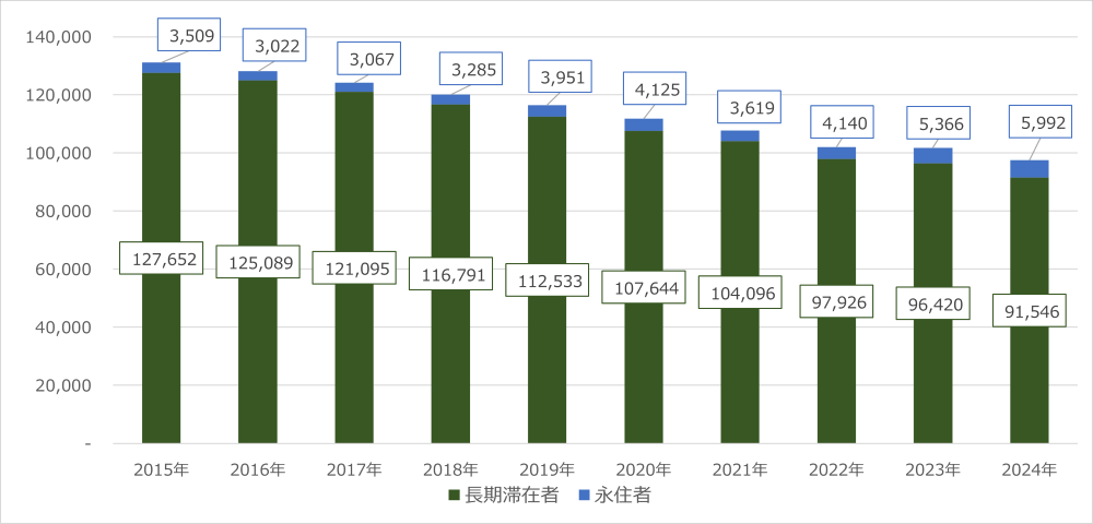 次に長期滞在者(※1)と永住者(※2)の推移を調べてみると、長期滞在者は2015年12万7,652人から2024年には9万1,546人に減少した一方で、永住者は3,509人から5,992人へと増加しました。(図2)