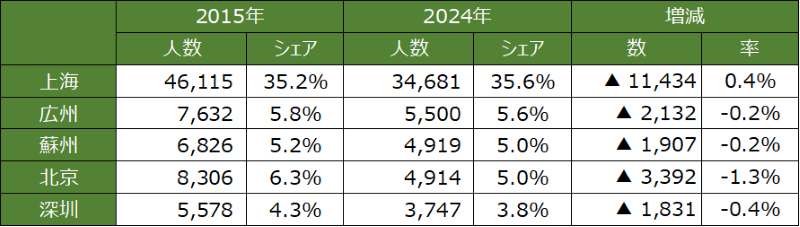 また、中国に滞在する日本人全体に占める割合で比較すると、減少幅が最も大きいのは北京で、2015年の6.3%から2024年には5.0%へと1.3ポイント減少しました。
