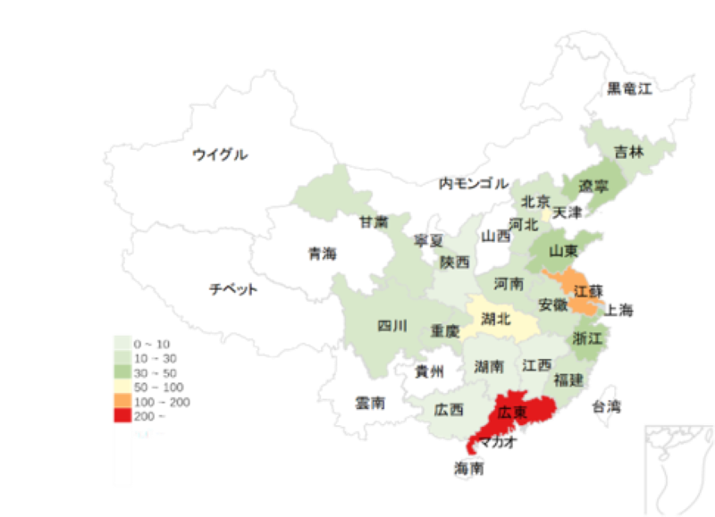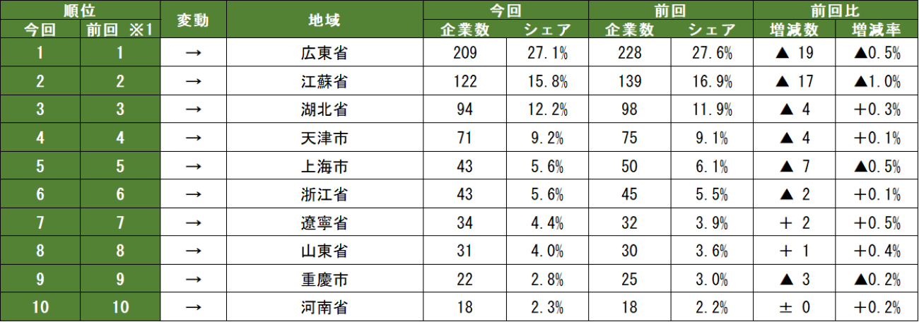 上位10地域の構成(表2)も前回調査と同様である。一方、広東省・江蘇省など従来の主要拠点はシェアが減少傾向にある。