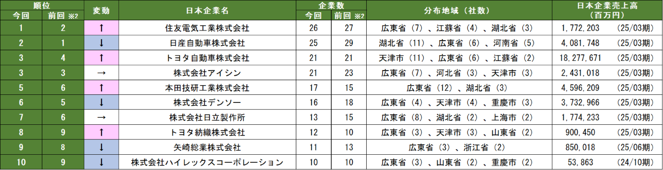 日本親会社別の現地法人社数ランキング(表1)では、「住友電気工業」が「日産自動車」を抜き、首位に浮上し、電動化対応部品の需要拡大を背景に、プレゼンスを高めている。次いで、「トヨタ自動車」が3位、「アイシン」が4位、「本田技研工業」が5位となっている。上位10社の顔ぶれは概ね前回調査と変わらず、上位企業において体制が安定している様子がうかがえる。