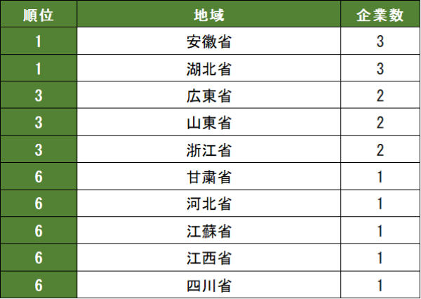 2023~2024年に新設された企業合計17社、その地域別ランキング(表3)をみると、安徽省と湖北省がそれぞれ3社で最多となっている。安徽省は奇瑞(Chery)、江淮(JAC)、蔚来(NIO)などの中国系自動車メーカーの本社所在地であり、2024年の自動車全国地域別生産台数は2位の262.0万台に達している。 表2にある日系自動車製造業の従来の上位地域 にない地域(安徽省、甘粛省、河北省、江西省、四川省)も現れ、地域の分散傾向がうかがえる。