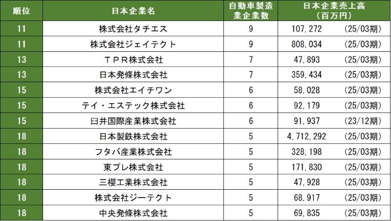 表4 中国日系自動車製造業の親会社別企業数ランキング 11位~23位