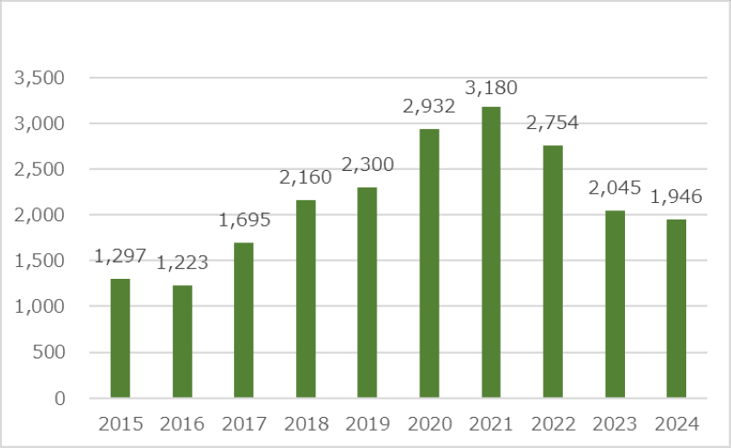 図1は、2015年から2024年までの10年間における商標出願件数の変化を示している。直近10年間の商標出願件数を分析すると、2015年から2021年にかけて、中国における日系企業の商標出願件数は一貫して増加傾向にあり、2015年時点では年間出願件数が1,000件程度であったのに対し、2021年には3,000件を超えるレベルに達し、過去10年間で最も高い水準を記録した。しかし、2021年をピークに出願件数は減少に転じ、2024年には年間2,000件を下回る水準まで落ち込んでいた。この傾向は、日系企業の中国市場における新規ブランド展開や製品投入の勢いが鈍化していることを示唆している。