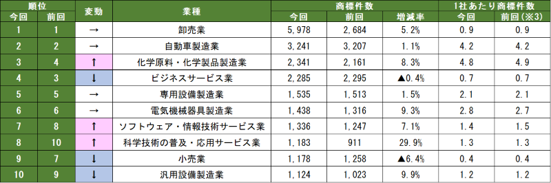 1社あたりの商標保有件数については、前回調査と概ね同数値で推移し、「化学原料・化学製品製造業」(1社あたりの商標保有数4.8件)、「自動車製造業」(同4.2件)、「電気機械器具製造業」(同2.8件)の3業種が他業種を上回っている。