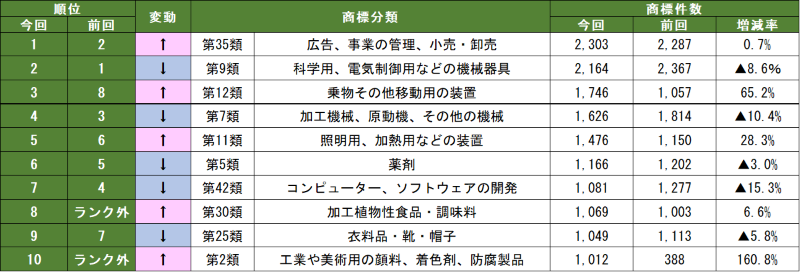 調査の結果、「第35類 広告、事業の管理、小売・卸売」(商標件数2,303件)が1位、「第9類 科学用、電気制御用などの機械器具」(同2,164件)が2位となり、前回と同様の上位を維持しつつも順位が入れ替わった。3位以降は順位の変動が激しい。特に、「第12類 乗物その他移動用の装置」と「第2類 工業や美術用の顔料、着色剤、防腐製品」は前回よりそれぞれ+65.2%、+160.8%と大幅に商標件数が増加し、3位と10位に達した。