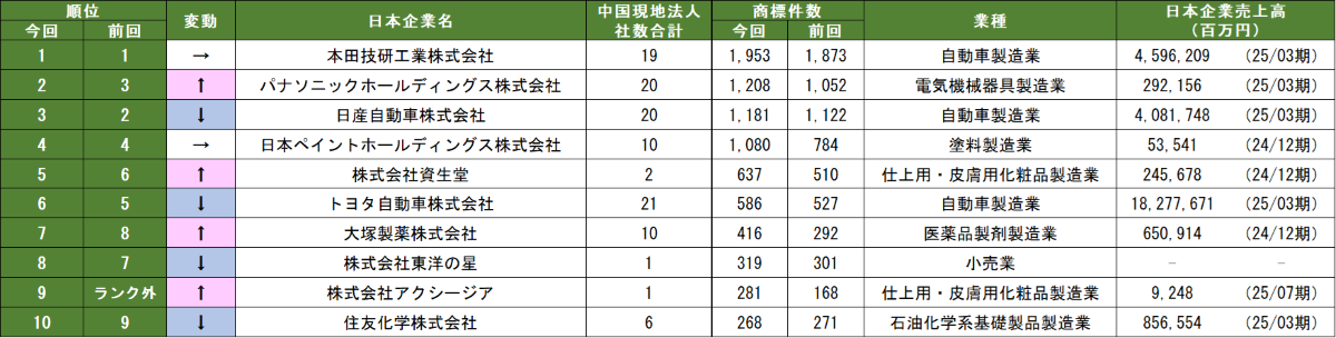 自動車、電機、化粧品、塗料といった業種の大手企業が引き続き中国市場において強い存在感を示している。