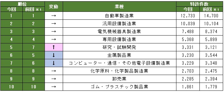 一方で、伸長する分野として、「研究・試験開発」は前回7位から5位へと順位を上げ、特許件数も3,331件に増加し、「化学原料・化学製品製造業」と「ゴム・プラスチック製品業」も着実に増加している。