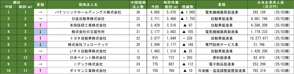 ・調査名称 : 中国日系企業の特許保有数ランキング(2026年調べ)