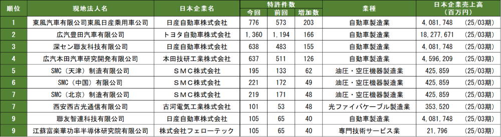 最も特許件数を増やしたのは、「日産自動車」の現地法人「東風日産乗用車」、前回から203件増の776件となった。また、同社は3位「深セン聯友科技」と10位「聯友智連科技」にもランクインし、上位10位に3拠点が入るという圧倒的な存在感を示している。2位には「トヨタ自動車」の「広汽豊田汽車」、166件の増加を記録した。4位には「本田技研工業」の「広汽本田汽車研究開発」がランクインし、126件の増加を記録した。日産・トヨタ・ホンダという日系自動車大手3社が特許増加数上位を占め、研究開発投資が依然活発であることを示している。5位から7位には「SMC」の拠点が3社連続で登場し、それぞれ40件以上の特許を増加させている。中国で半導体・半導体製造装置、医療関連設備の国産化が進む中、「SMC」は中国市場で業績を伸ばしていることが特許増加につながっていると考えられる。