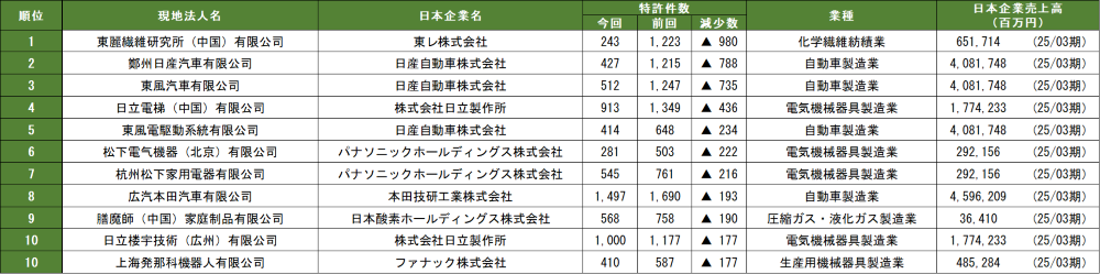 最も大きな減少幅を記録したのは、「東レ」の「東麗繊維研究所(中国)」、前回の1,223件から今回の243件へと980件の大幅減となった。続く2位から5位には、「日産自動車」の現地法人が3社ランクインし、特に「鄭州日産汽車」は788件、「東風汽車」は735件の減少と、顕著な落ち込みを見せている。「日立製作所」の現地法人も、4位と10位に登場し、「日立電梯(中国)」は436件の減少、「日立楼宇技術(広州)」も177件減となった。「パナソニック」も2拠点がランクインしており、「松下電気机器(北京)」は222件の減少、「杭州松下家用電器」も216件減と、いずれも2割以上の落ち込みを見せている。