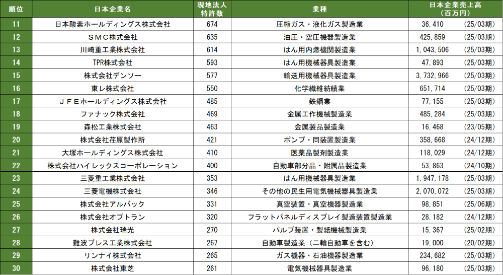 表5 中国日系企業の特許数ランキング 11~30位