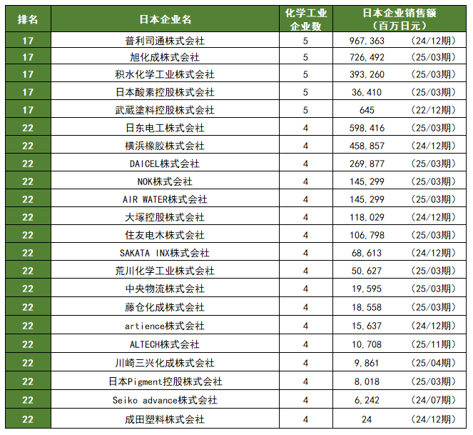 表3 中国日系化学工业母公司企业数排名 第17位~第38位