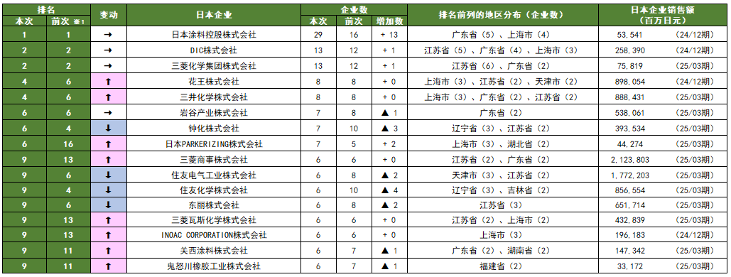 按日本母公司划分的当地法人数量排名(表1)显示,”日本涂料控股”(Nippon Paint Holdings)仍以绝对优势位居首位。其在中国市场以”立邦”品牌广为人知,在广东、上海等城市化发展地区集中布局据点。第2名由”三菱化学集团”和”DIC”并列,均主要布局于江苏、广东等主要工业地带。与上次调查相同,排名前3位的企业中有2家是涂料制造商,日系涂料企业在中国市场的存在感尤为突出。