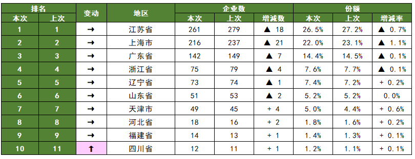 前10位地区构成(表2)与上次调查相比虽无显著排名变动,但在江苏省减少18家、上海市减少21家等,主要地域的企业数量和占比均呈缩小趋势。
