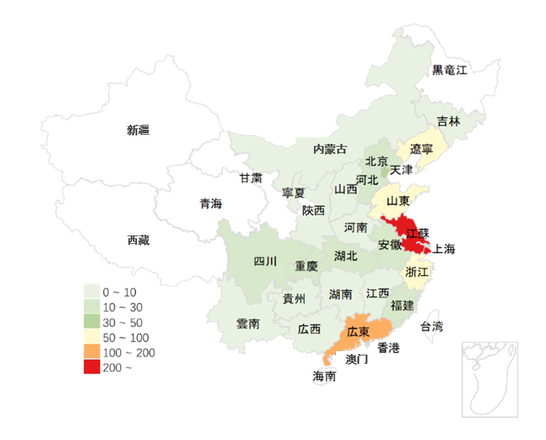 另一方面,值得关注的是”涂料、油墨、颜料及类似产品制造”的扩张。企业数从上次调查的88家增至100家,构成比也从8.6%大幅上升至10.2%。由此超过”日用化学产品制造”,跃居企业数量第4位的细分行业。在城市化发展、环境监管强化、功能性涂料需求增加的背景下,这一领域可以说是日系企业技术优势易于发挥的领域。