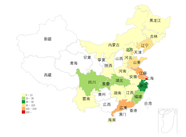 关于中国日系物流企业的地区分布(图2),依然集中于东部沿海地区和大型港口地区。上海、深圳等国际港口对外贸易处理量大,且具备作为经济特区的制度优势,因此为日资企业提供了稳定的商业环境。