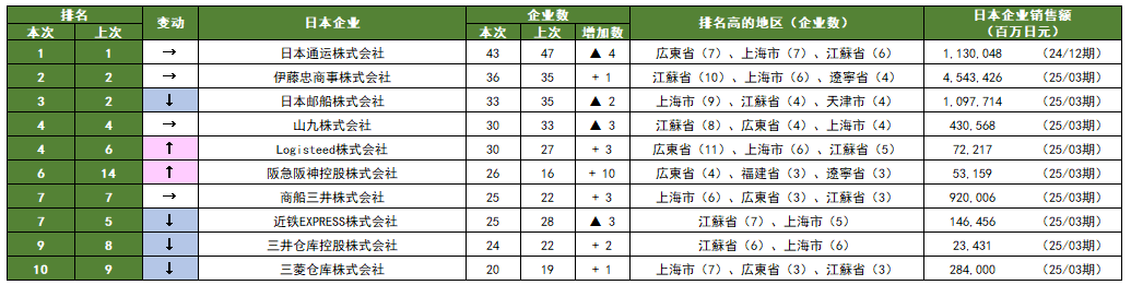 按日本母公司划分的当地法人数量排名(表1)显示,”日本通运”虽保持第1位,但从47家减少至43家。第2位是”伊藤忠商事”(36家),第3位是”日本邮船”(33家)。排名靠前的企业主要集中在上海市、江苏省、广东省等基础设施完善的沿海主要地区。