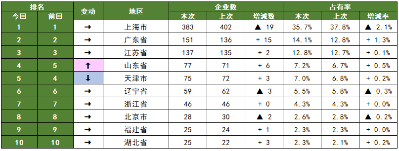 表2 中国物流业 地区企业数量排名 第1位~第10位