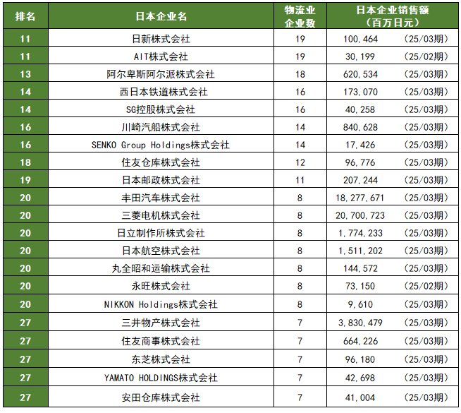 【参考资料】表3 中国日系物流行业母公司企业数排行第11位~29位