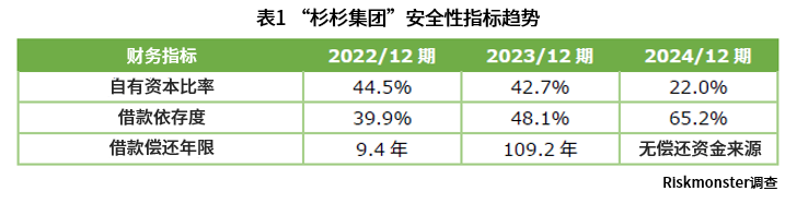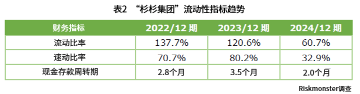 “现金存款周转期”是指企业作为营业支付准备资金,持有多少个月份资金量的指标。根据Risk Monster的破产概率分析,现金存款周转期”不足1个月”即为高风险水平。杉杉集团的现金存款周转期在2024年12月期末为2.0个月,虽未达高风险水平,但相比前一年度(3.5个月)资金余裕已大幅缩减。
