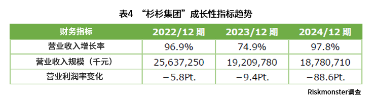 成长性是通过销售额及利润的增减率,来显示企业面向未来发展扩张的潜力。根据Risk Monster的破产概率统计,减收企业相比增收企业破产概率更高,当销售额减5%以上时,多数行业呈现破产概率上升的趋势。此外,无论增减方向如何,变动幅度越大,破产概率越高的倾向也越明显。杉杉集团的销售额已连续三期下滑,其中2023年12月期同比大幅减少25.1%,加之营业利润率自2022年12月期起连续三期恶化,特别是2024年(-88.6个百分点)的骤降,可见其盈利能力已严重恶化。
