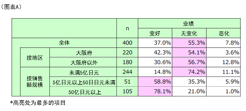 按地区比较“大阪府”企业与“非大阪府”企业的回答率发现,大阪府企业选择“改善”的比例高出11.7个百分点(42.3%),选择“恶化”的比例则低9.2个百分点(12.8%)。这表明,虽然世博会的利好波及整个关西圈,但在举办地大阪府,正面影响尤为明显。