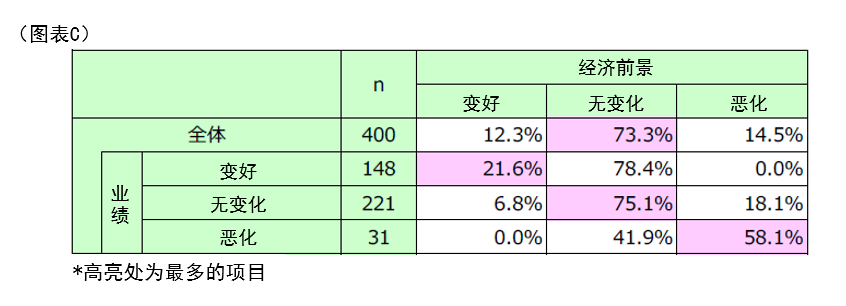 按企业自身业绩来看,业绩“改善”的企业中,约两成认为经济前景也会“改善”(21.6%),相对乐观;而业绩“恶化”的企业中,超过半数认为经济前景同样会“恶化”(58.1%),反映出对世博会未能扭转业绩下滑的担忧情绪较为强烈。(图表C)