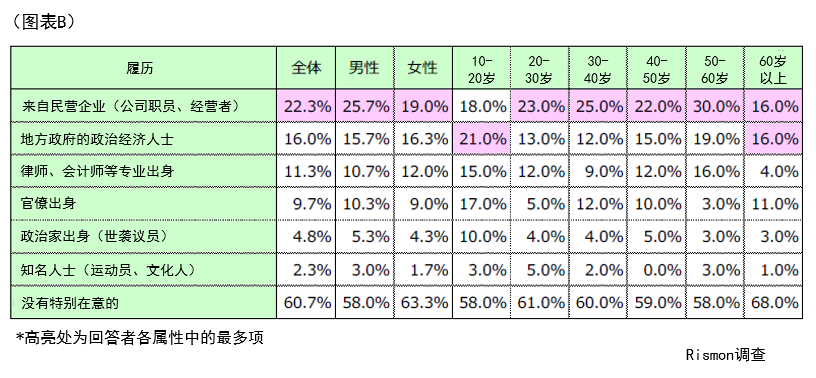 此外,“地方政界经验者”(16.0%)高于“官僚出身”(9.7%)和“政治世家出身”(4.8%),可见选民对地方政治的评价高于中央,更期待有执行力的政治家。