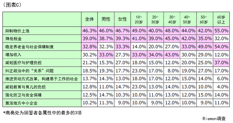 “抑制物价上涨”在 60 岁以上靠养老金生活的群体以及收入较低的 10 多岁人群中呼声最高;“降低税负”则最受育儿期的 30 岁(45.0%)与 40 岁(42.0%)群体关注;而“养老金与社保制度稳定”在 50 岁以上人群中支持率显著,反映出各世代对生活不安的差异。(见图 C)