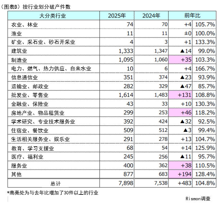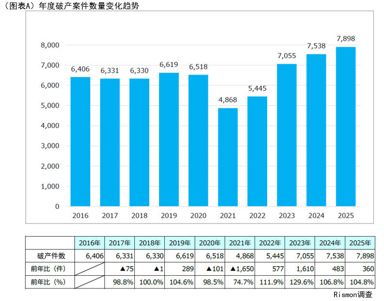 2025年日本国内法人破产案件数为7,898起,较上年(7,538起)增长4.8%。受新冠疫情期间的纾困政策影响,2021年破产数一度大幅减少,但自2022年起持续回升,2025年更创下近10年新高。(见图A)