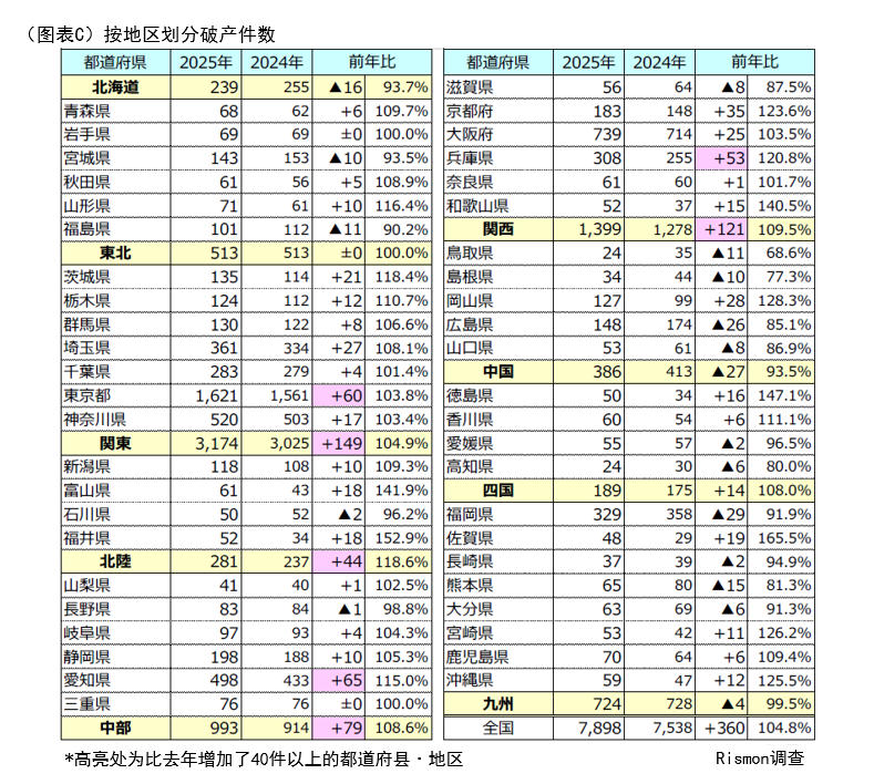 按都道府县划分,29个都府县的破产数量高于去年,其中“爱知县”(498起,同比增加65起,增幅115.0%)和“东京都”(1,561起,同比增加60起,增幅103.8%)的破产数量明显增加;而“福井县”(52起,同比增加18起,增幅152.9%)和“德岛县”(50起,同比增加16起,增幅147.1%)的增幅尤为显著。另一方面,16个都府县的破产数量低于去年,特别是“福冈县”(329起,同比减少29起)和“广岛县”(148起,同比减少26起)的降幅较为明显。(图表C)