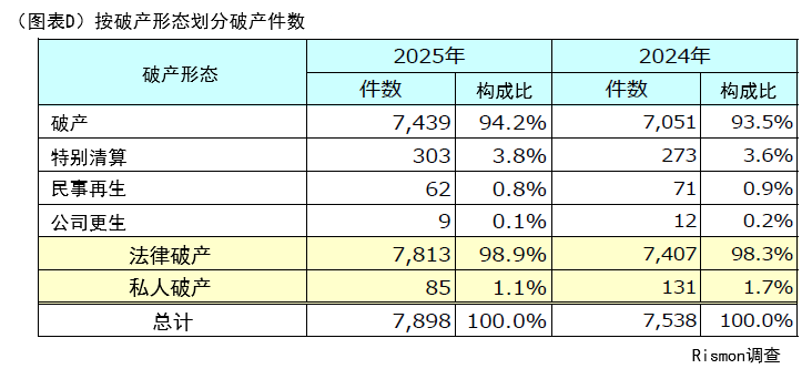 按破产形态来看,“法律破产”占据绝大多数;在程序类别中,“破产”(7,439件)占整体的94.2%。若再加上“特别清算”(303件),“清算型”破产程序合计达整体的98%,而“民事再生”或“公司更生”等“重建型”破产程序则不足1%。(图表D)