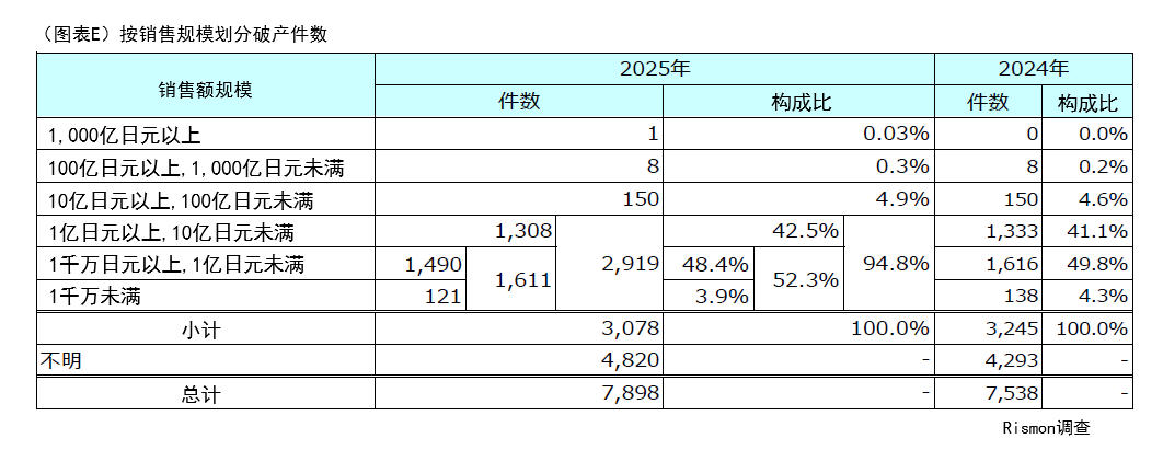至于占全部破产企业约六成、销售额不明的企业,从信息披露意愿推断,多半也属于中小或小微企业,因此即使以全部7,898家破产企业为对象,其分布也与上述结果几乎无异。(图表E)