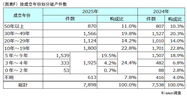 另一方面,“50年以上”(占比11.0%)的老字号企业,在10年区间对比中破产比例最低,可见多数企业经营已趋稳定。(图表F)