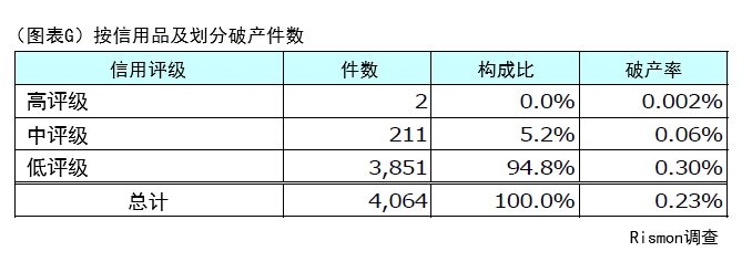 根据 Risk Monster 提供的信用评级划分,破产案件中“低评级”(3,851 起,占比 94.8%)约占 95%。从破产概率来看,低评级企业(破产概率 0.30%)是高评级企业(破产概率 0.002%)的 150 倍以上,可见低评级企业需高度关注破产风险。(图表 G)