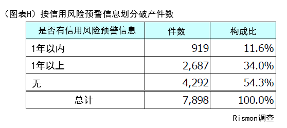 从是否出现信用风险预警信息来看,约半数(占比45.7%)的破产企业此前曾传出过某种信用风险预警,且其中超过一成(占比11.6%)在破产前一年内就被捕捉到相关预警信息。(图表H)