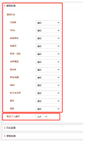 ③ 需要进行邮件通知的功能设定为「通知」并将转发个人邮件设定为「允许」。最后,点击最下方的保存。