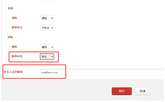 ②对需要进行邮件通知的功能设定为「通知」,将邮件转发设定为「转发」。最后,点击保存。